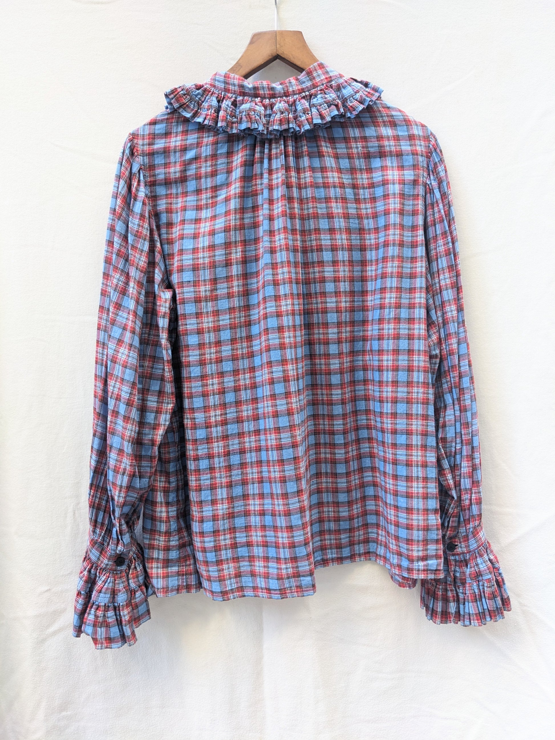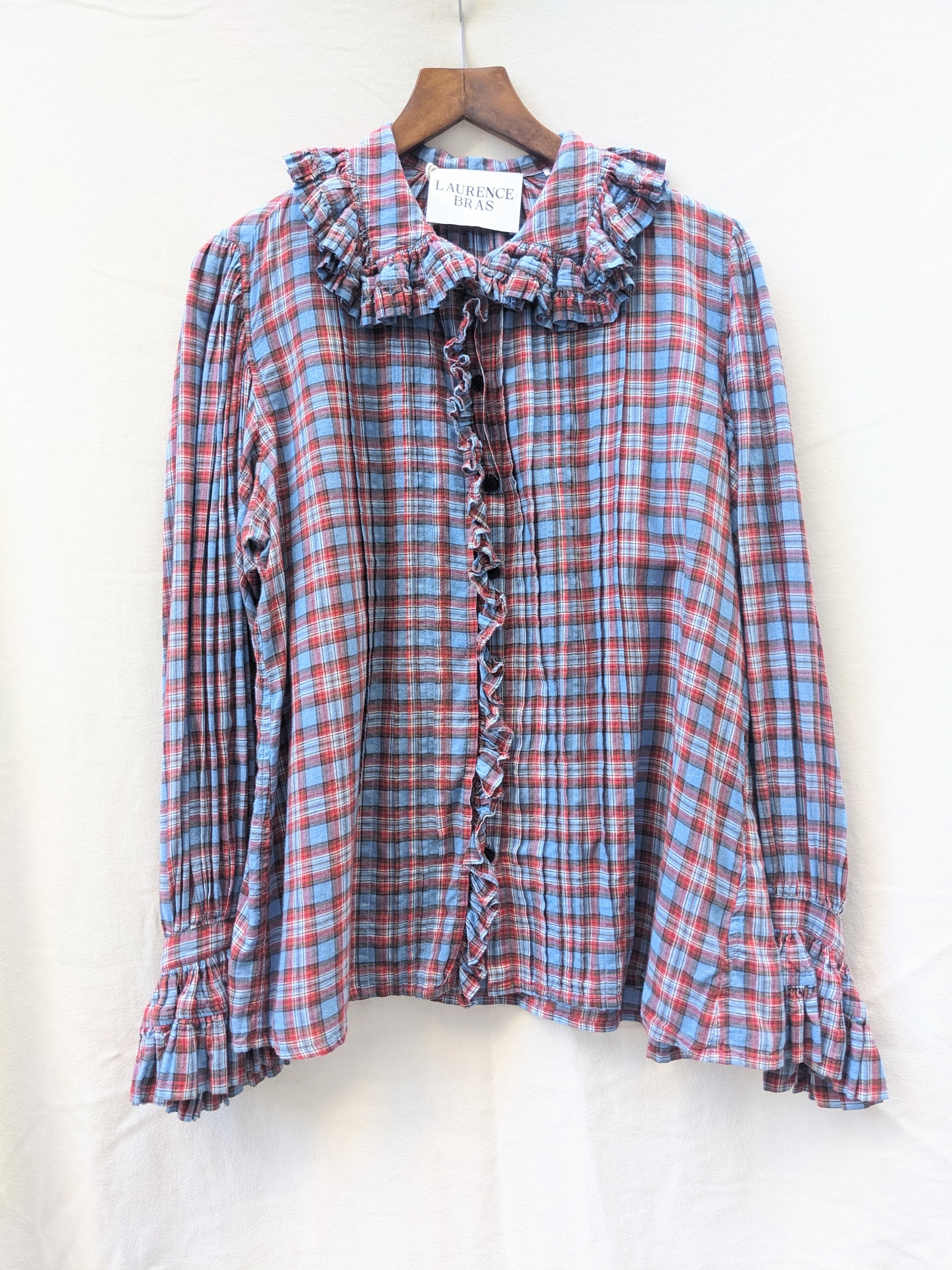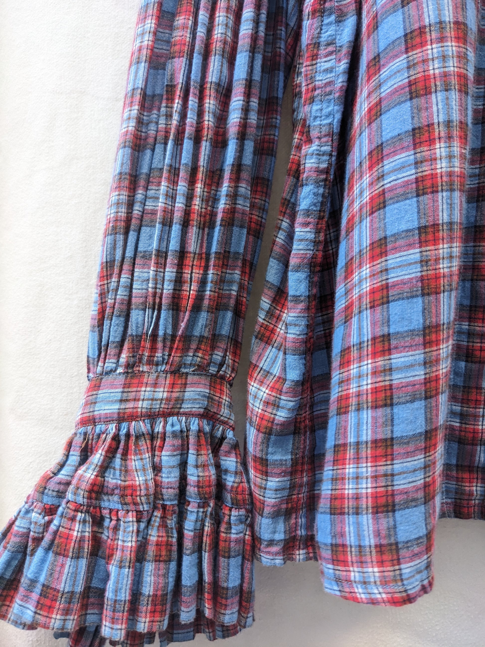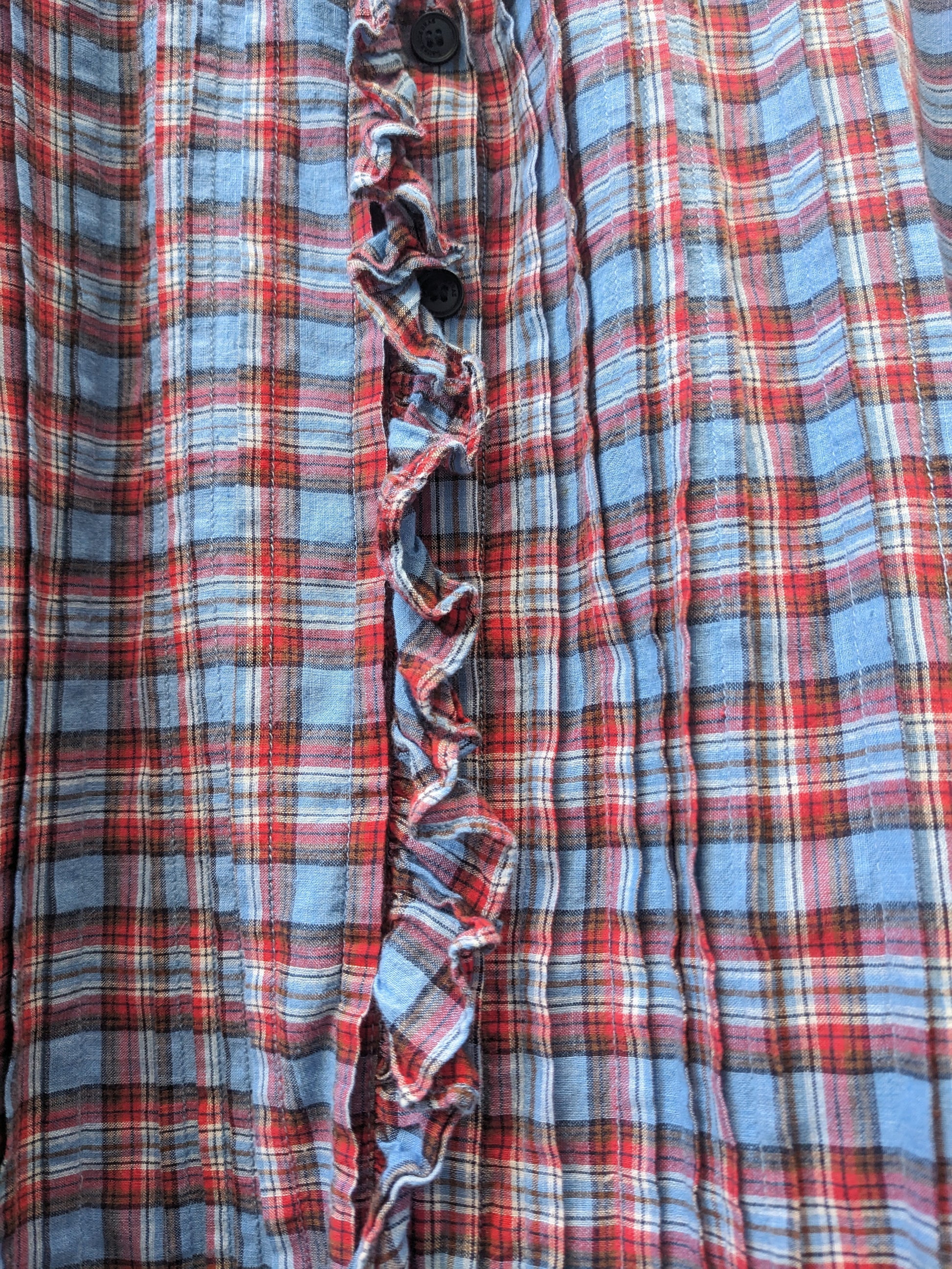 Volants, plis. Carreaux bleus, rouges.