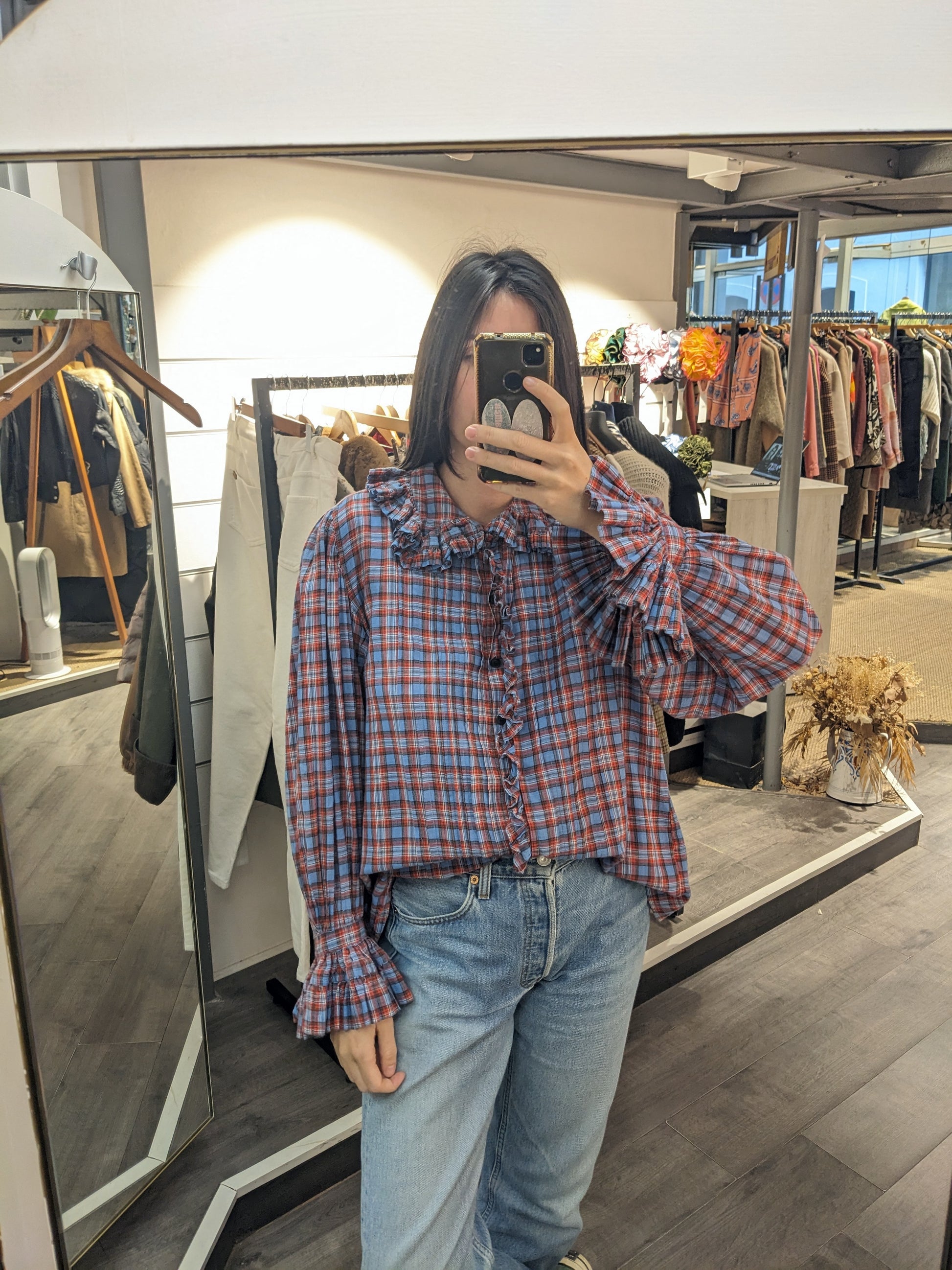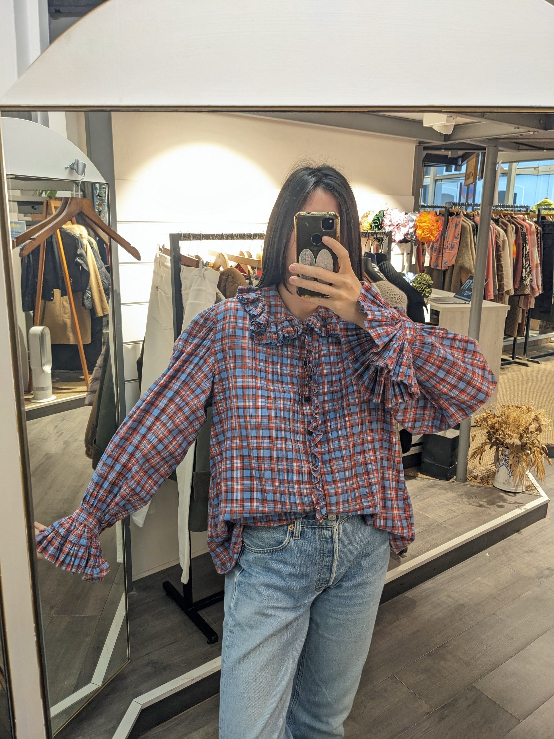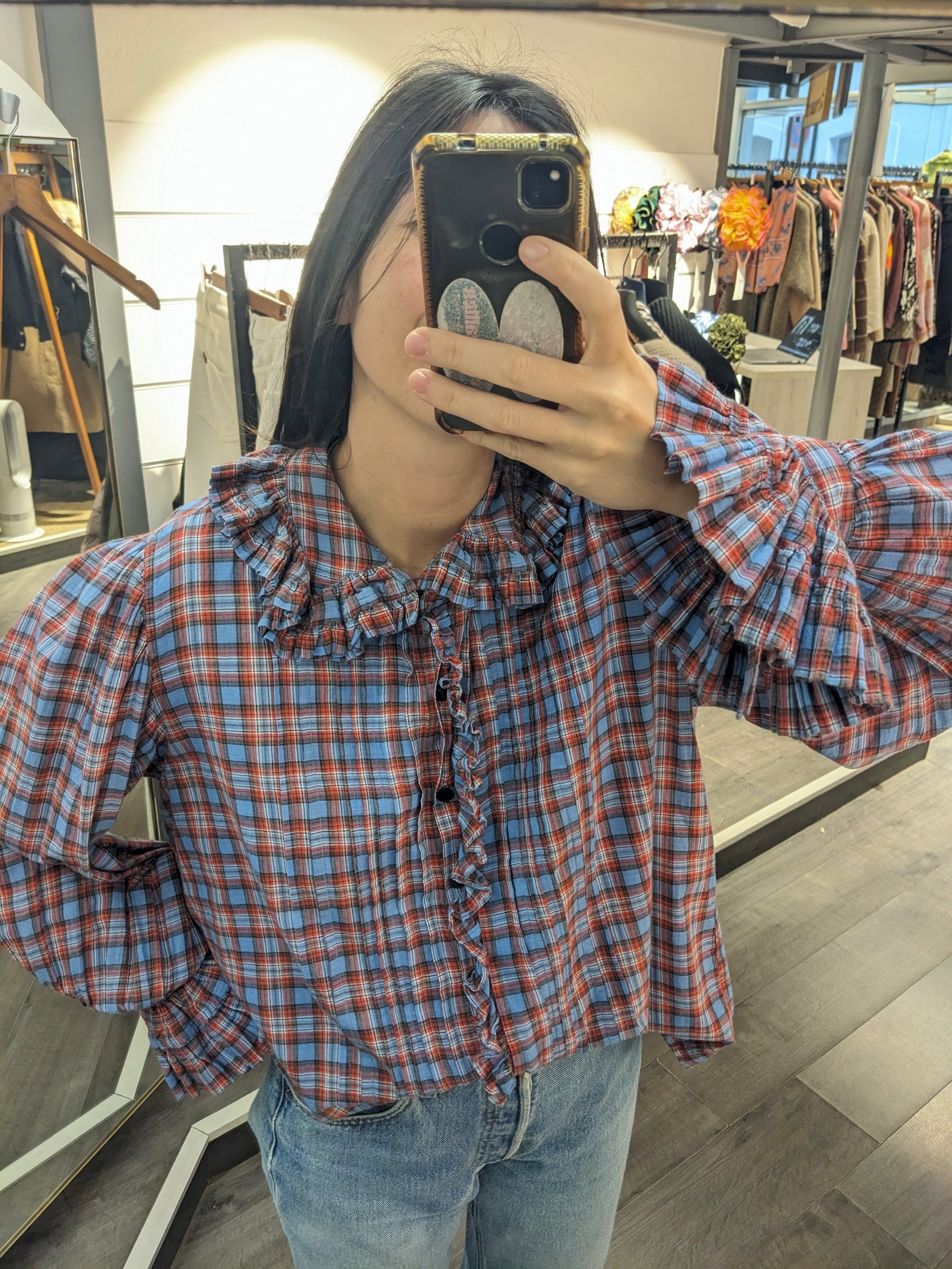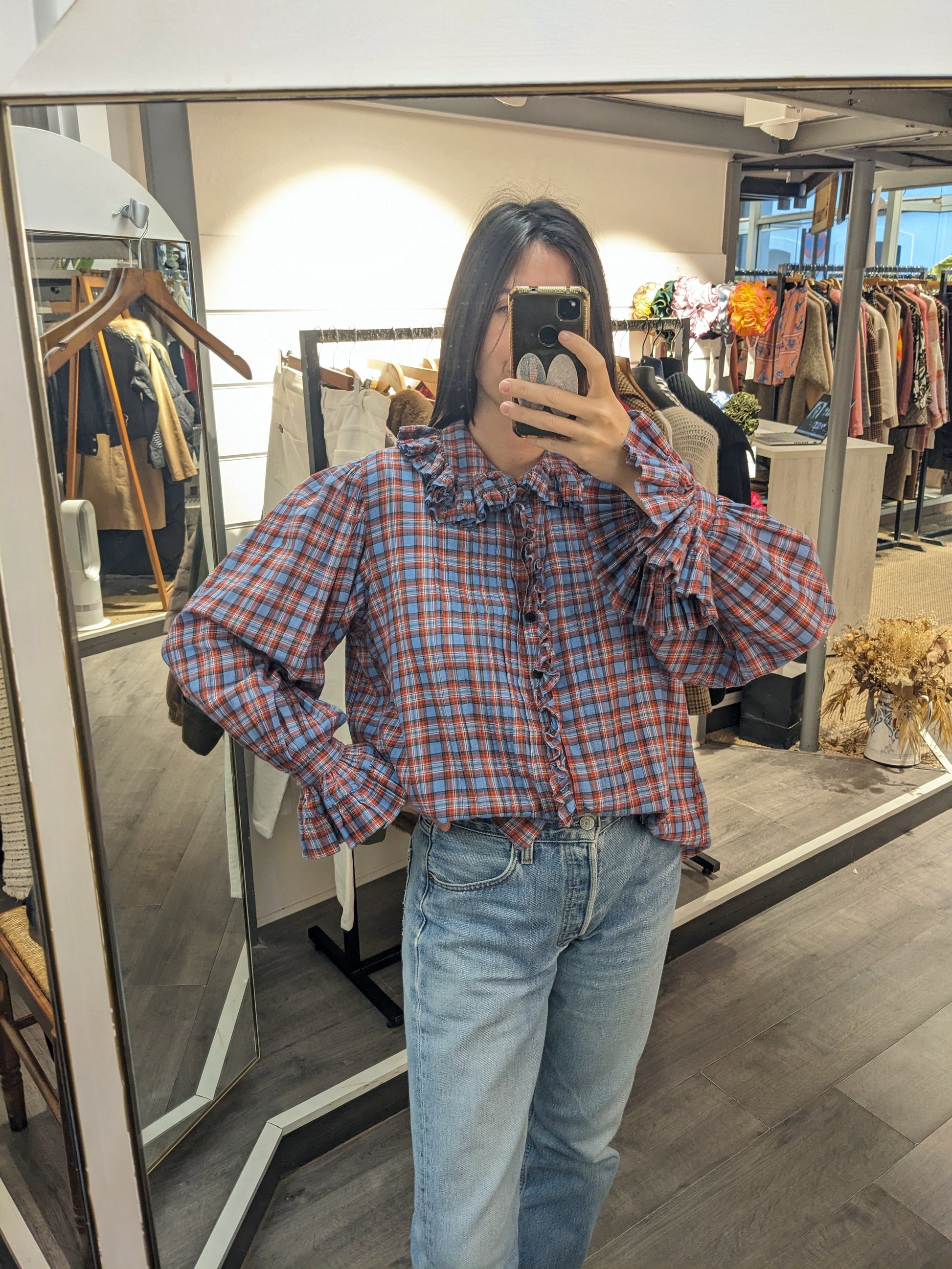 Volants, plis. Carreaux bleus, rouges.