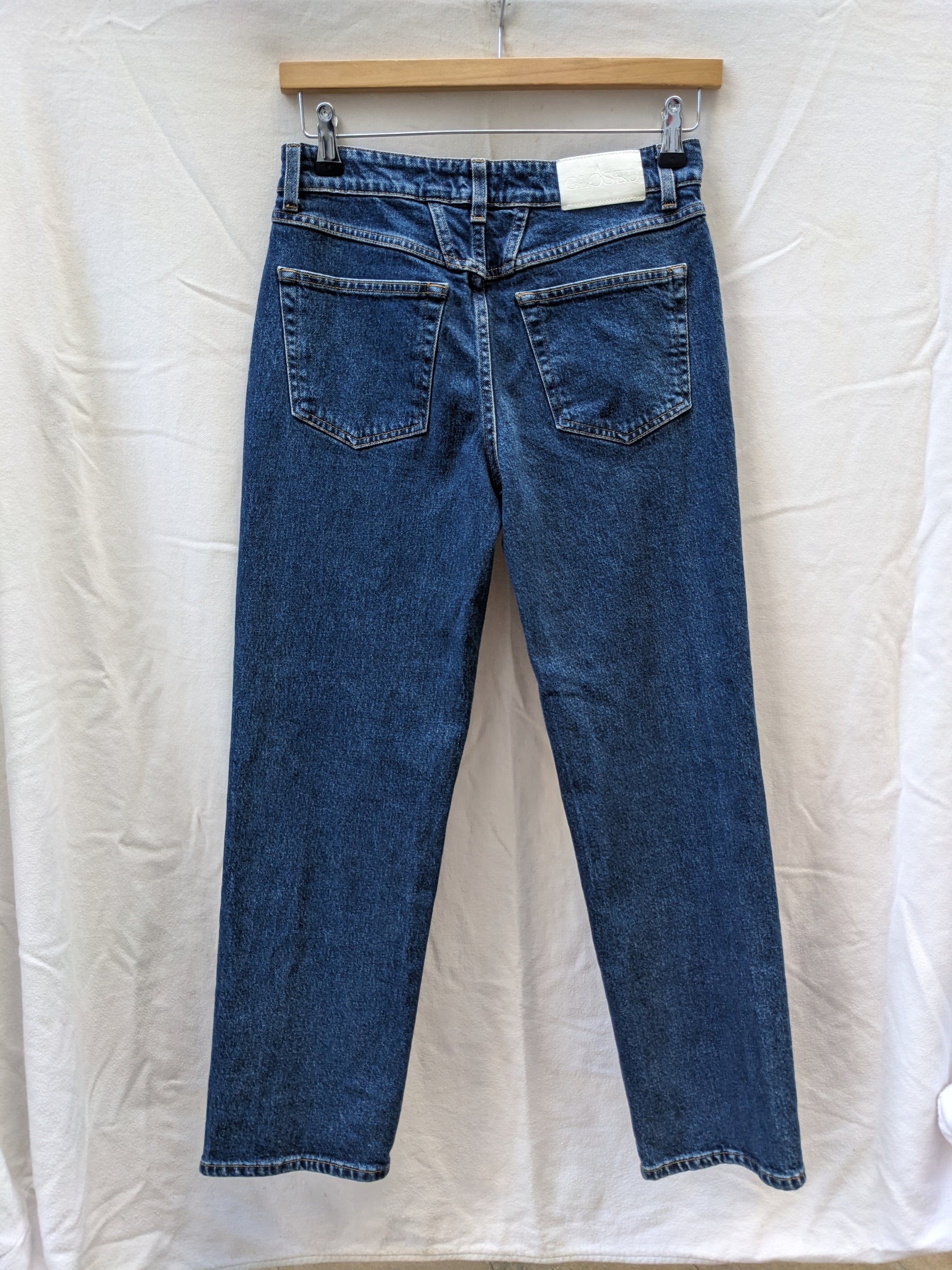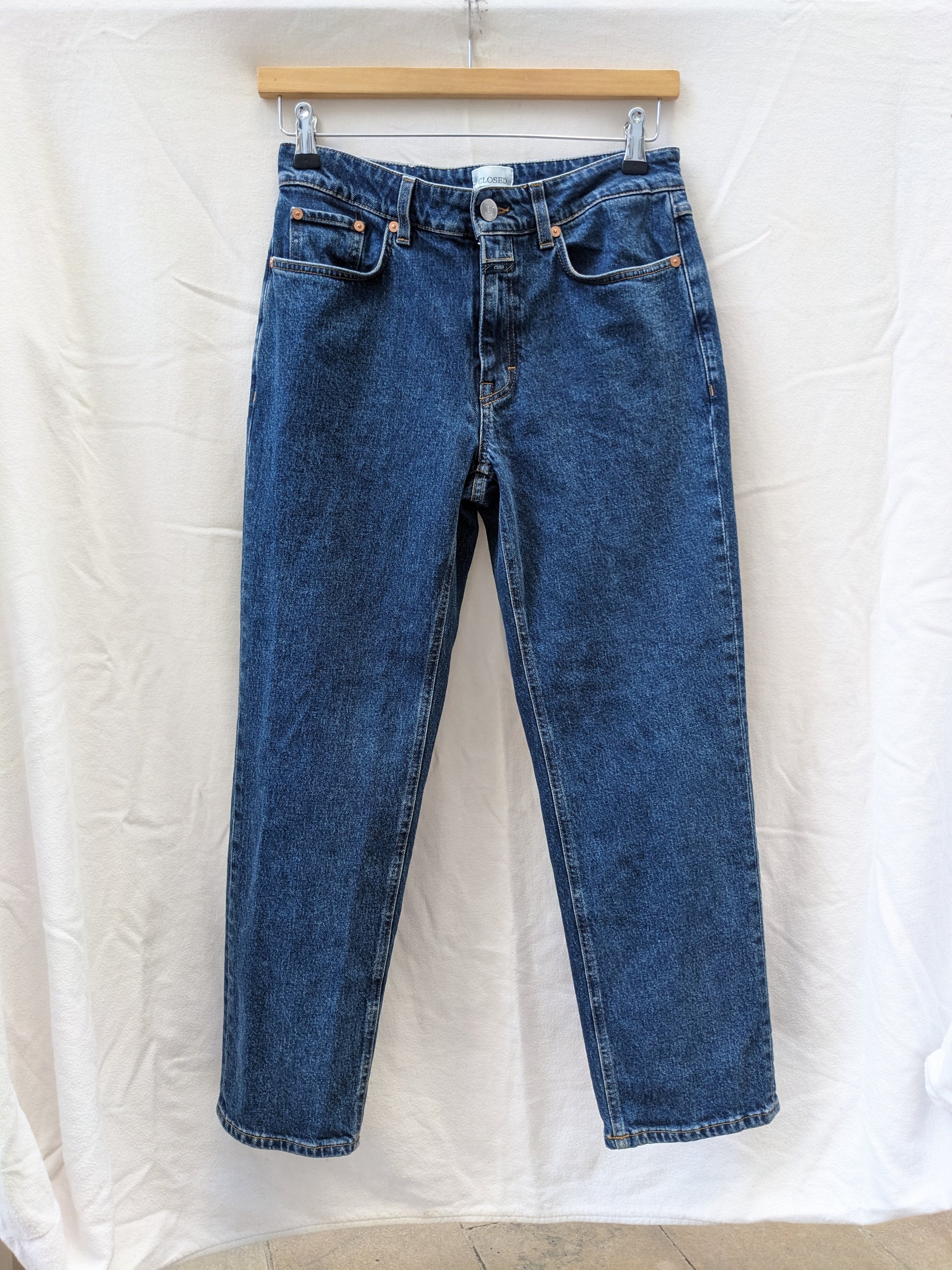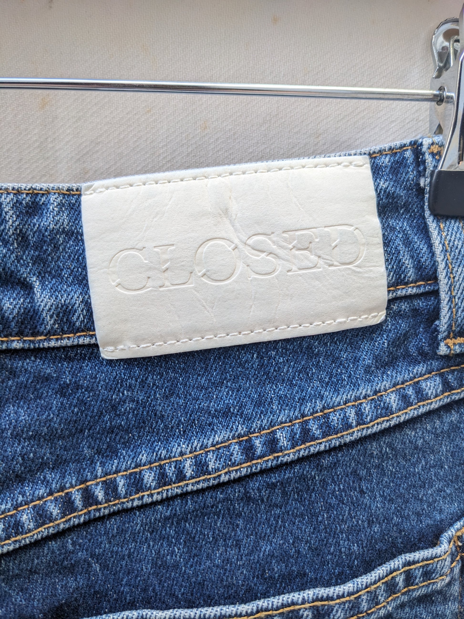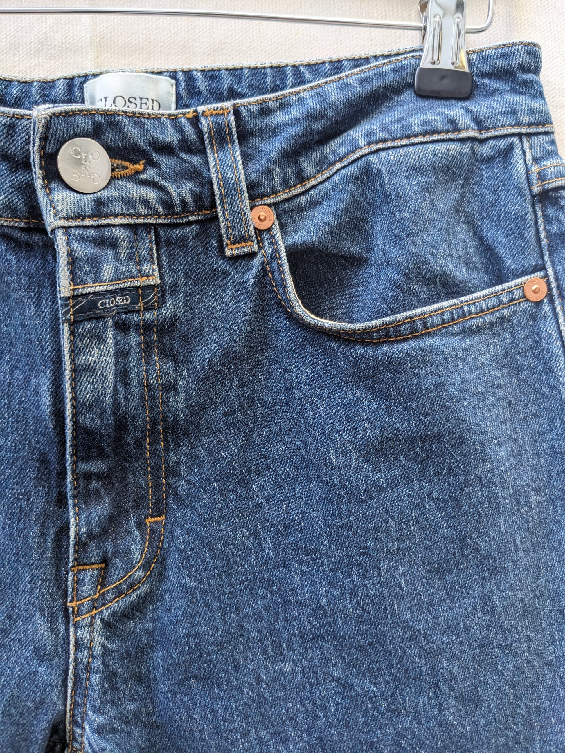 Coupe droite. Taille haute. Braguette zippée + bouton.