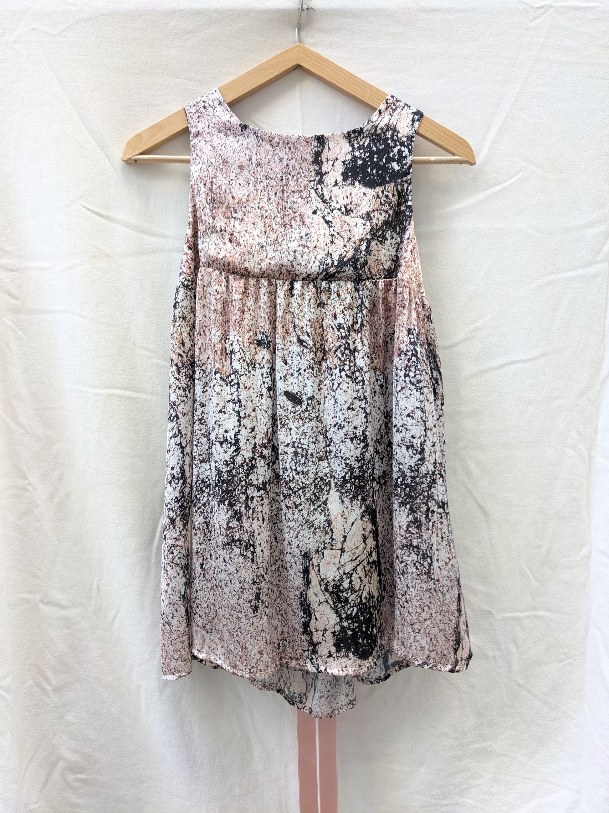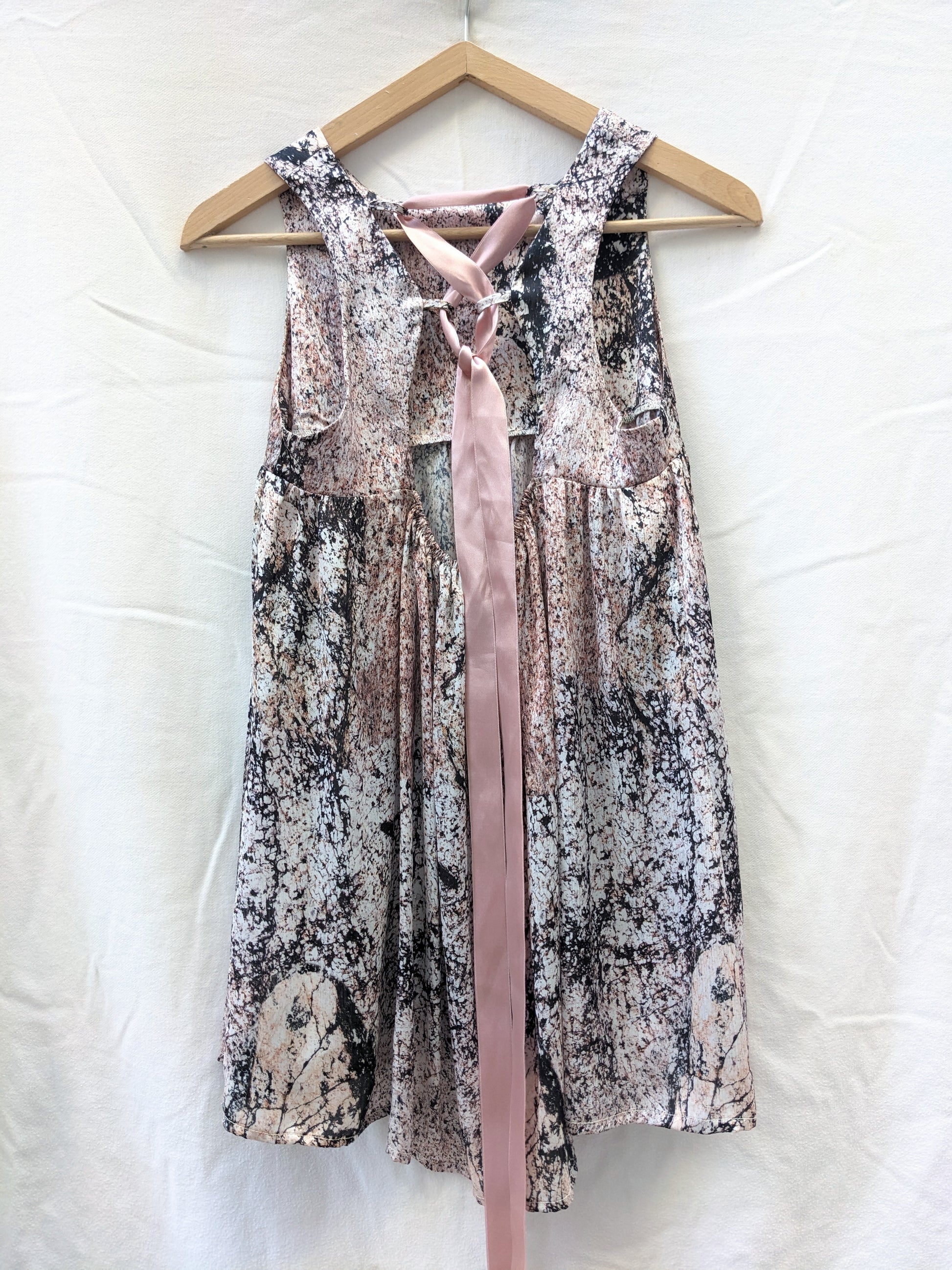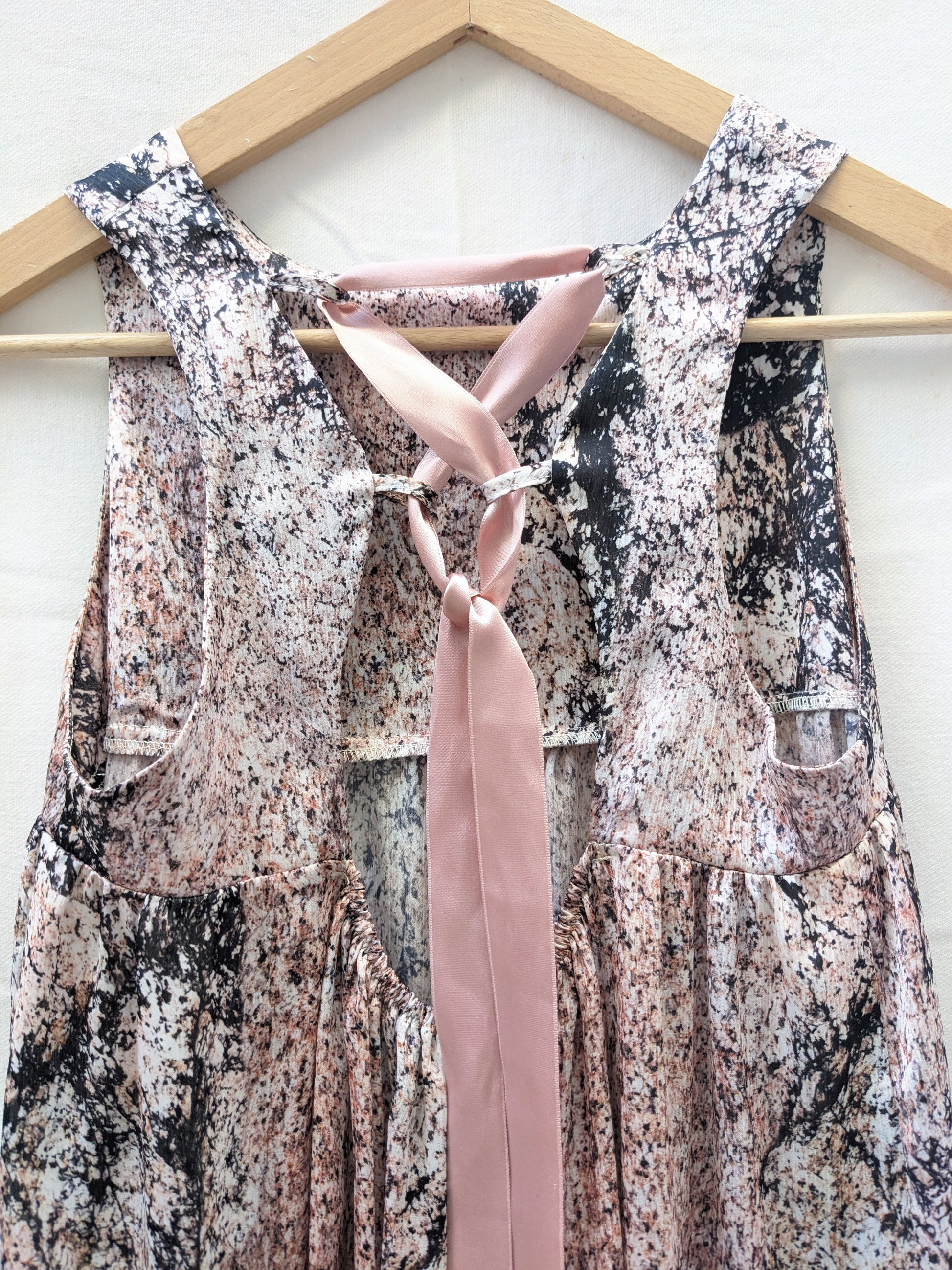 Encolure ronde. Rubans satin dans le dos.